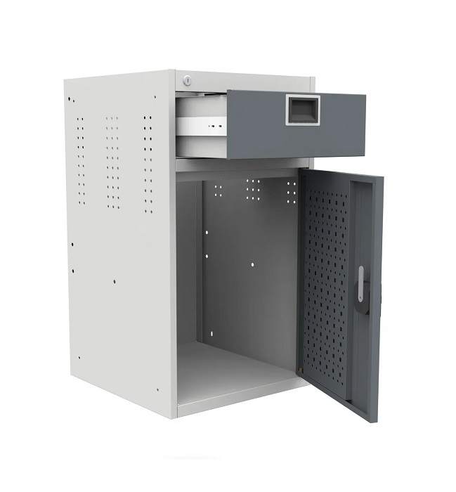 В комплектацию верстака входит: столешница 1280 SMART, тумба SMART 4, тумба SMART 1-1, тумба-пенал SMART, два перфорированных экрана SMART 1280, комплект косынок для экрана SMART, две стойки 1150 для крепления 2го экрана Smart/Woker ral 7035, комплект освещения SMART. Столешница выполнена из фанеры 27 мм со стальной окрашенной накладкой 1,2 мм. Тумба SMART 4 комплектуется 4 выдвижными ящиками. Выдвижные ящики оборудованы телескопической системой полного выдвижения ящиков с фиксацией в закрытом состоянии (50000 циклов). Тумба SMART 1-1 комплектуется одной дверью, одним выдвижным ящиком и регулируемой по высоте полкой. Тумба-пенал SMART выдвигается на четырех телескопических направляющих и предназначена для хранения крупногабаритных инструментов и аксессуаров. Все тумбы закрываются ключевым цилиндровым замком. Секретность замка 2000 комбинаций (2 ключа в комплекте). Внутренние стенки дверей и перфорированный экран имеют универсальную перфорацию для размещения навесных элементов. Шаг квадратной перфорации (10 мм) - 38х38 мм, круглой (7 мм) - 25х38 мм. Возможна смена стороны открывания двери тумбы. Цвет верстака: корпус тумб - серый Ral 7035, столешница, двери тумб, лицевая панель ящиков - антрацит Ral 7016. Поставляется в разобранном виде.