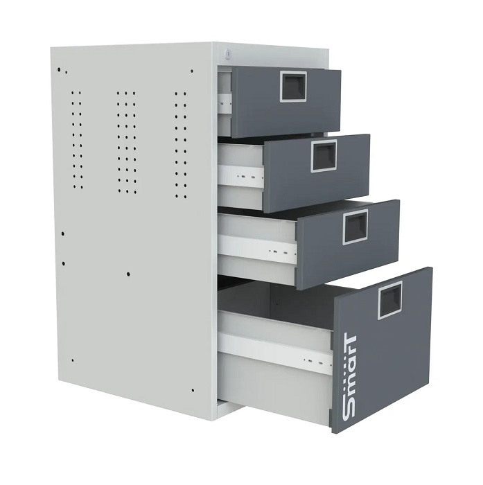 В комплектацию верстака входит: столешница 1760 SMART, тумба SMART 4, тумба SMART 1, тумба-пенал SMART, ящик подвесной Smart-1. Столешница выполнена из фанеры 27 мм со стальной окрашенной накладкой 1,2 мм. Тумба SMART 1 комплектуется одной дверью, одной регулируемой по высоте полкой. Тумба SMART-4 комплектуется 4 выдвижными ящиками. Выдвижные ящики оборудованы телескопической системой полного выдвижения ящиков с фиксацией в закрытом состоянии (50000 циклов). Тумба-пенал SMART выдвигается на четырех телескопических направляющих и предназначена для хранения крупногабаритных инструментов и аксессуаров. Ящик подвесной Smart-1 прикручивается под столешницу верстака. Все тумбы закрываются ключевым цилиндровым замком. Секретность замка 2000 комбинаций (2 ключа в комплекте). Внутренние стенки дверей имеют универсальную перфорацию для размещения навесных элементов. Шаг квадратной перфорации (10 мм) - 38х38 мм, круглой (7 мм) - 25х38 мм. Возможна смена стороны открывания двери тумбы. Цвет верстака: корпус тумб - серый Ral 7035, столешница, двери тумб, лицевая панель ящиков - антрацит Ral 7016. Поставляется в разобранном виде.
