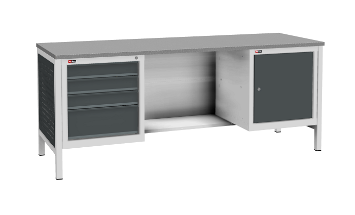 Цвет верстака: серый Ral 7038, панель облицовочная и лицевая панель ящиков/дверей антрацит Ral 7016. Тип покрытия: эпоксидная порошковая краска. Поставляется в разобранном виде