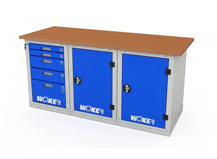 В комплектацию верстака входит: столешница Woker 2000, две тумбы Woker 01, одна тумба Woker 05. Столешница выполнена из шлифованной березовой многослойной фанеры толщиной 30 мм. Снаружи фанера обработана влагостойким антисептиком цвета "красное дерево", что придает фанере повышенную влагостойкость и более темный цвет. Тумба Woker 01 имеет две регулируемые по высоте полки (шаг 50 мм). Полки тумбы установлены на стальные салазки, которые позволяют выдвигать полку на себя на 70% для облегчения разгрузки/погрузки. Дверь тумбы закрывается на цилиндрический замок со стальной поворотной ручкой, секретность замка 2000 комбинаций. Открывание двери на 180 градусов. Тумба Woker 05 комплектуется 5 выдвижными ящиками (2 высотой - 135 мм, 2 высотой - 65 и 1 высотой - 275 мм). Полезный размер ящика: (ШхГ) 459х612 мм. В ящиках есть противоскользящие коврики и набор наклеек с пиктограммами для маркировки содержимого.